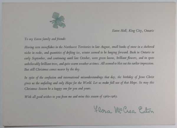 Printed holiday greeting card for 1962-63 from widowed Lady Flora McCrea Eaton, matriarch of the...