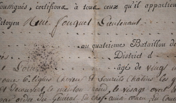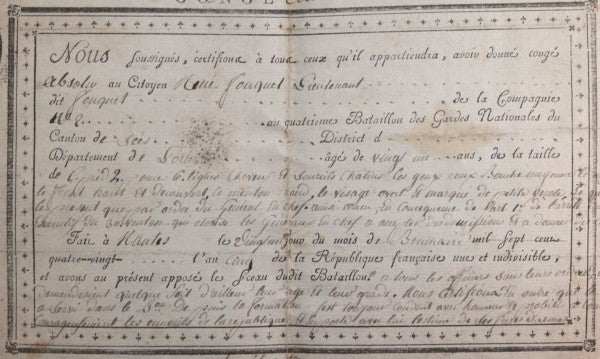 Congé absolu pour lieutenant Réné Fouquet, 21 ans, companie No. 2 du quatrième bataillon des gardes...