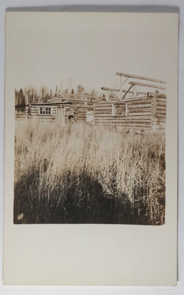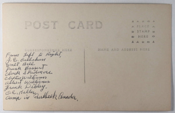Postcard with photo of men sitting and standing outside of a log and plank building,...