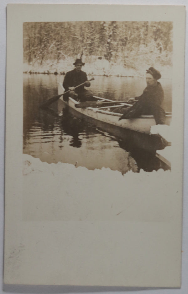 RPPC postcard winter photo of convoy of wagons traveling along mud path in forest, headed...