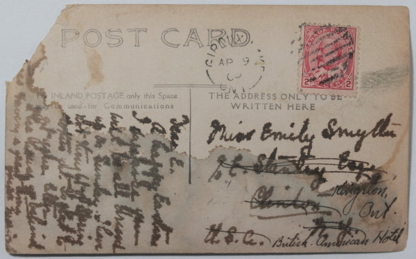 Postmarked 'GIROUX ONT AP9 09(?)' on 2 cent King Edward VII stamp, mailed to Clinton NY, redirected back to British American Hotel Kingston ON.